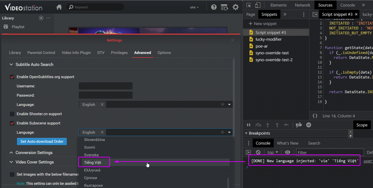Trên Video Station của Synology có plugin Subscene để tự động tìm kiếm và download phụ đề khá hay, nhưng rất tiếc, mặc định plugin này lại không có tiếng Việt để bạn lựa chọn. Bài viết dưới đây sẽ hướng dẫn bạn thêm Tiếng Việt vào option download nhé.